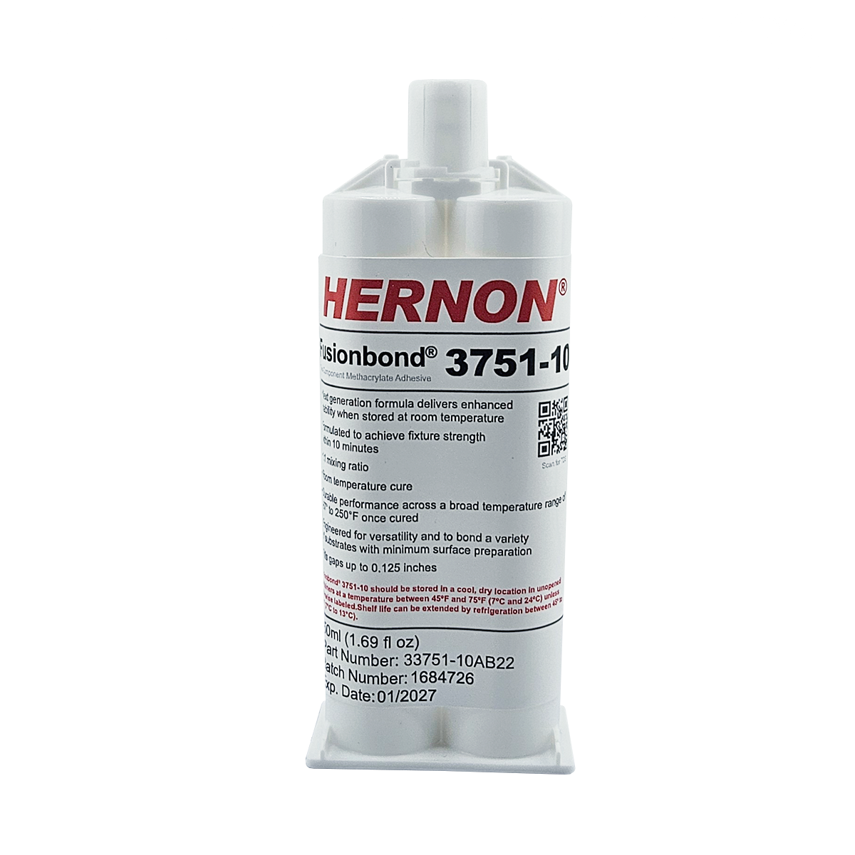 Hernon® Fusionbond® 3751-10 is two-component methacrylate adhesive designed for room-temperature curing with a 1:1 mix ratio. This next-generation formula offers enhanced stability when stored at room temperature. Fusionbond® 3751-10 achieves fixture strength within 10 minutes and provides durable performance across a wide temperature range of -67°F to 250°F. Engineered for versatility, Fusionbond® 3751-10 bonds a variety of substrates with minimal surface preparation. Recommended substrates include various metals, PVC, acrylic, ABS, and fiberglass. Product Features •Non-sagging gaps filled to 0.125 inch. •Superior impact and peel strength •Minimal or no surface preparation •Rapid room temperature cure •100% reactive •Excellent environmental and chemical resistance •Gasoline resistance
