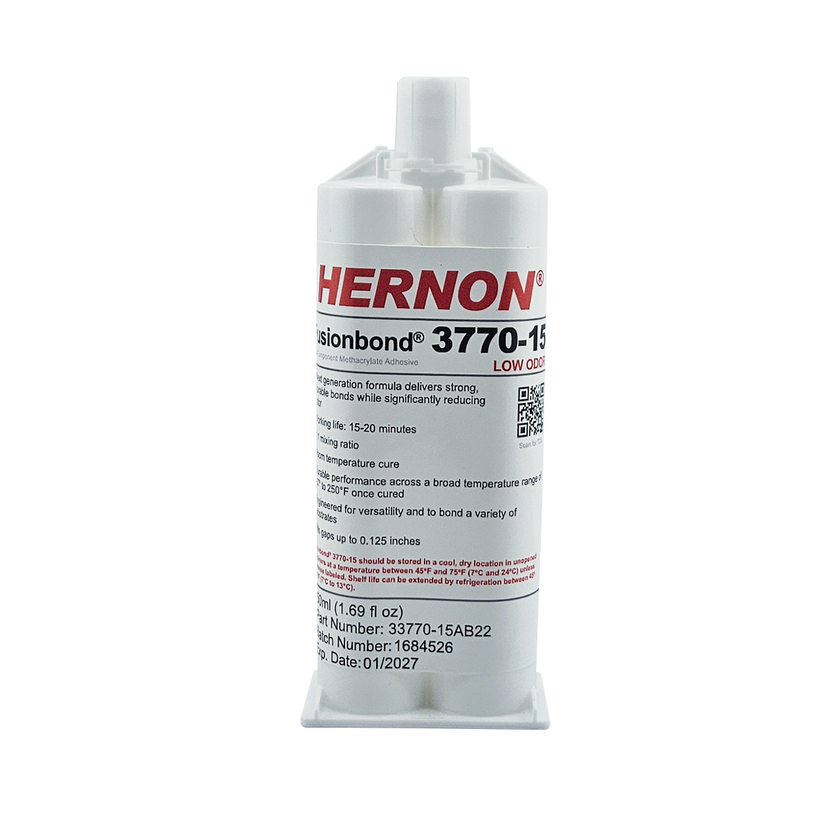 Hernon® Fusionbond® 3770-15 is a high-performance, two-component methacrylate adhesive that cures at room temperature with a 1:1 mix ratio. Engineered with advanced technology, this next-generation formula delivers strong, durable bonds while significantly reducing odor. Fusionbond® 3770-15 offers a working life of 15 to 20 minutes. Once cured, it delivers durable performance across a broad temperature range of -67°F to 250°F. Designed for versatility, Fusionbond® 3770-15 effectively bonds a wide range of substrates such as various metals and some plastics such as acrylic and fiberglass. Product Features: •Formula fills gaps up to 0.125 inches •High shear strength with high resistance to environmental factors •Low odor formula